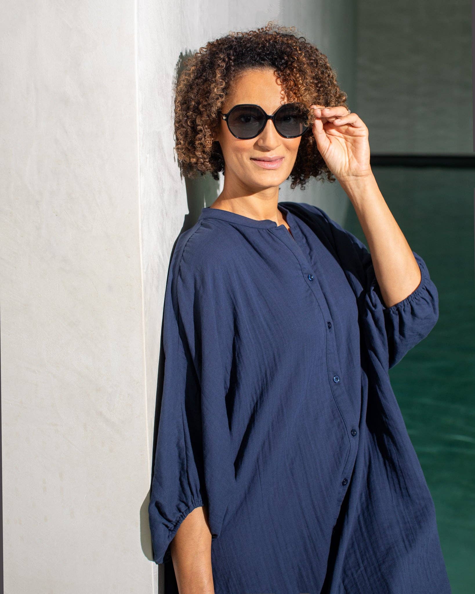 The Dora Dress is a midi length, double gauze dress finished with a grandad collar and button up front. Dora has a stunning elasticated 3/4 length puff sleeve creating a unique silhouette.