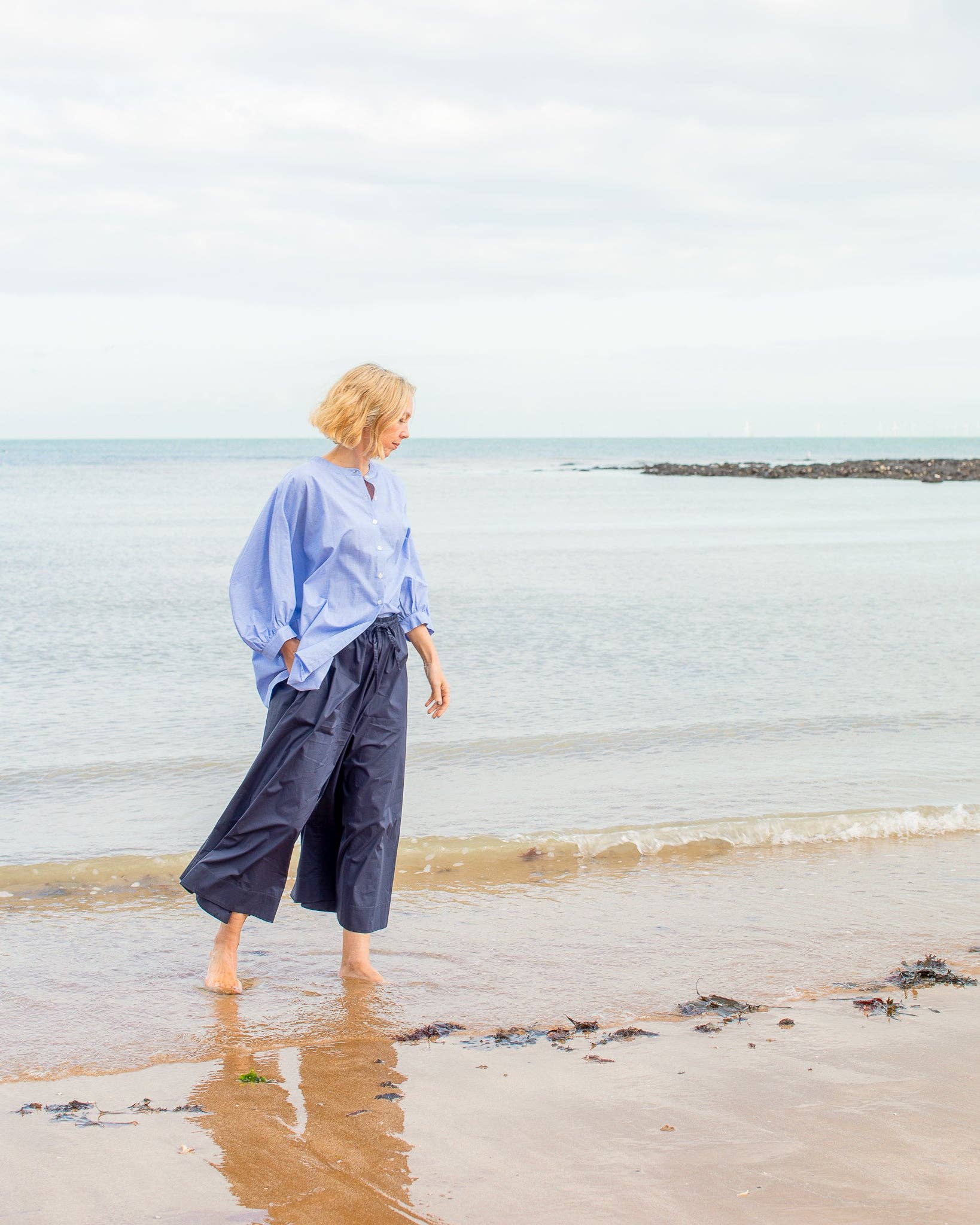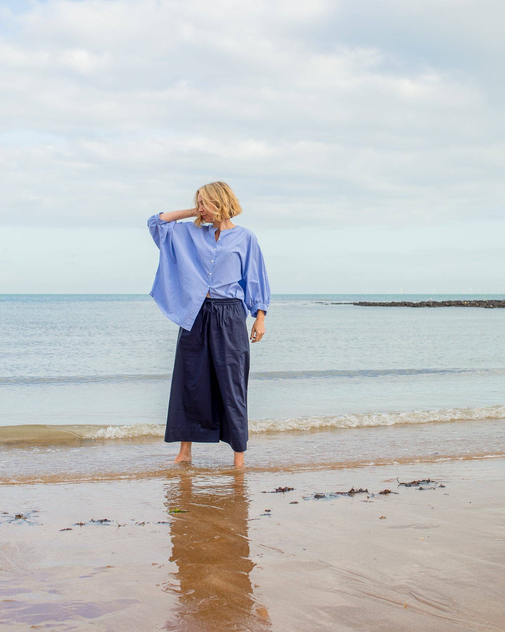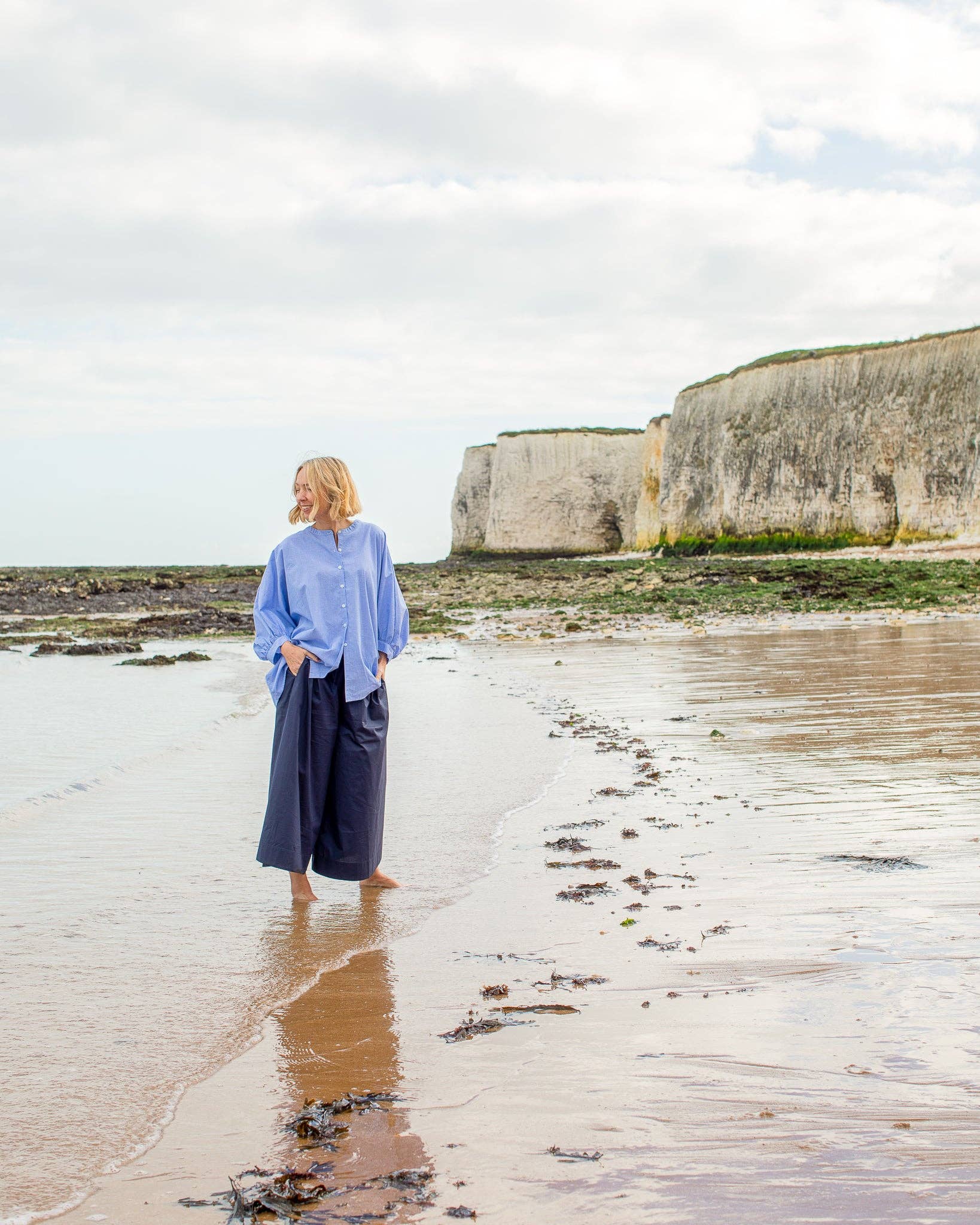 Poppy is a full body, bat wing, oversized shirt. Featuring a grandad collar, three quarter length sleeves, and an inverted pleat in the back. Poppy is a perfect oversized and easy to style shirt.