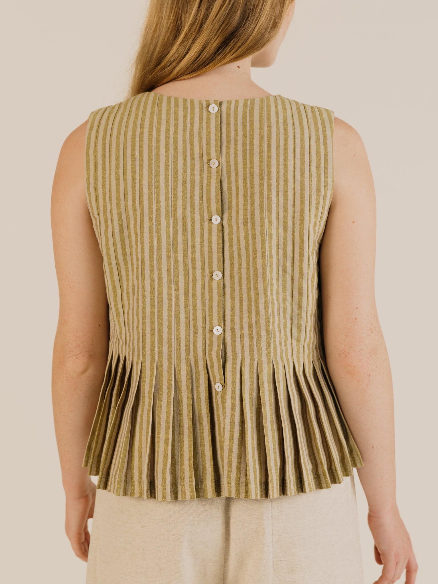 We absolutely love this pretty new top from SIDELINE STUDIO. This style is pleated all-over with the pleats opening out at the hem to create peplum design. This style is crafted from a lovely ochre and natural coloured stripe which is enhanced by the pleats. The Minnie Top has a button down back feature making it interesting from the front and back.