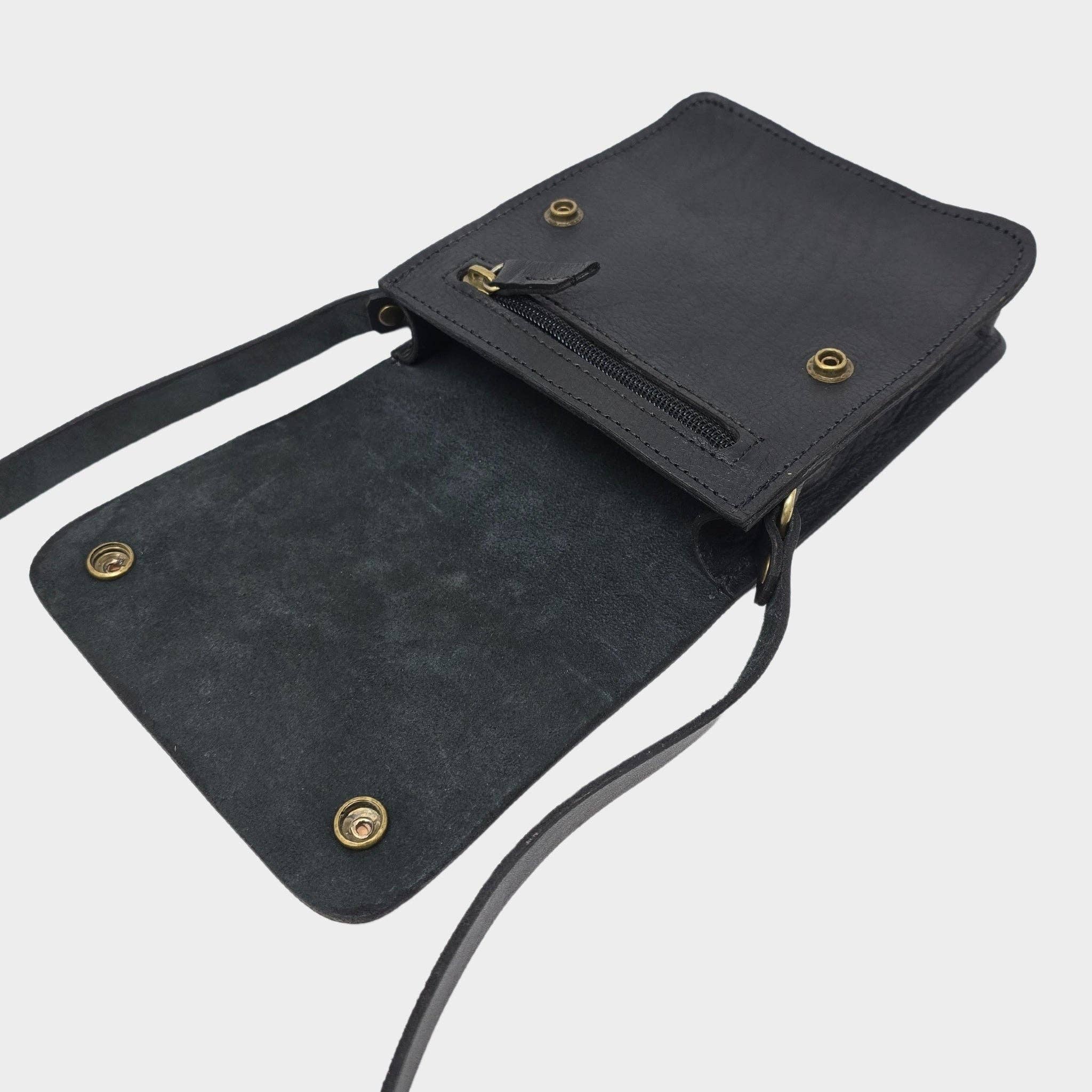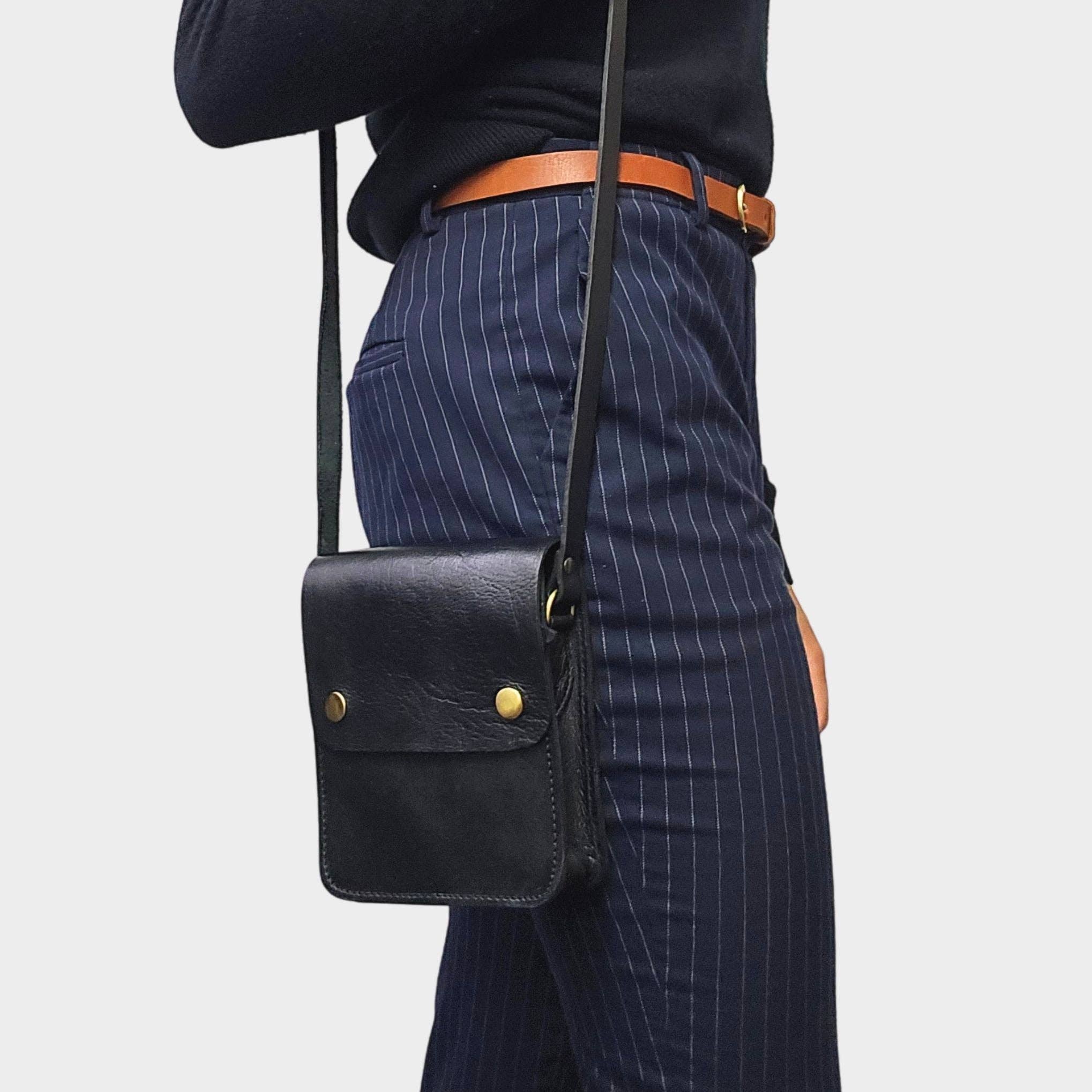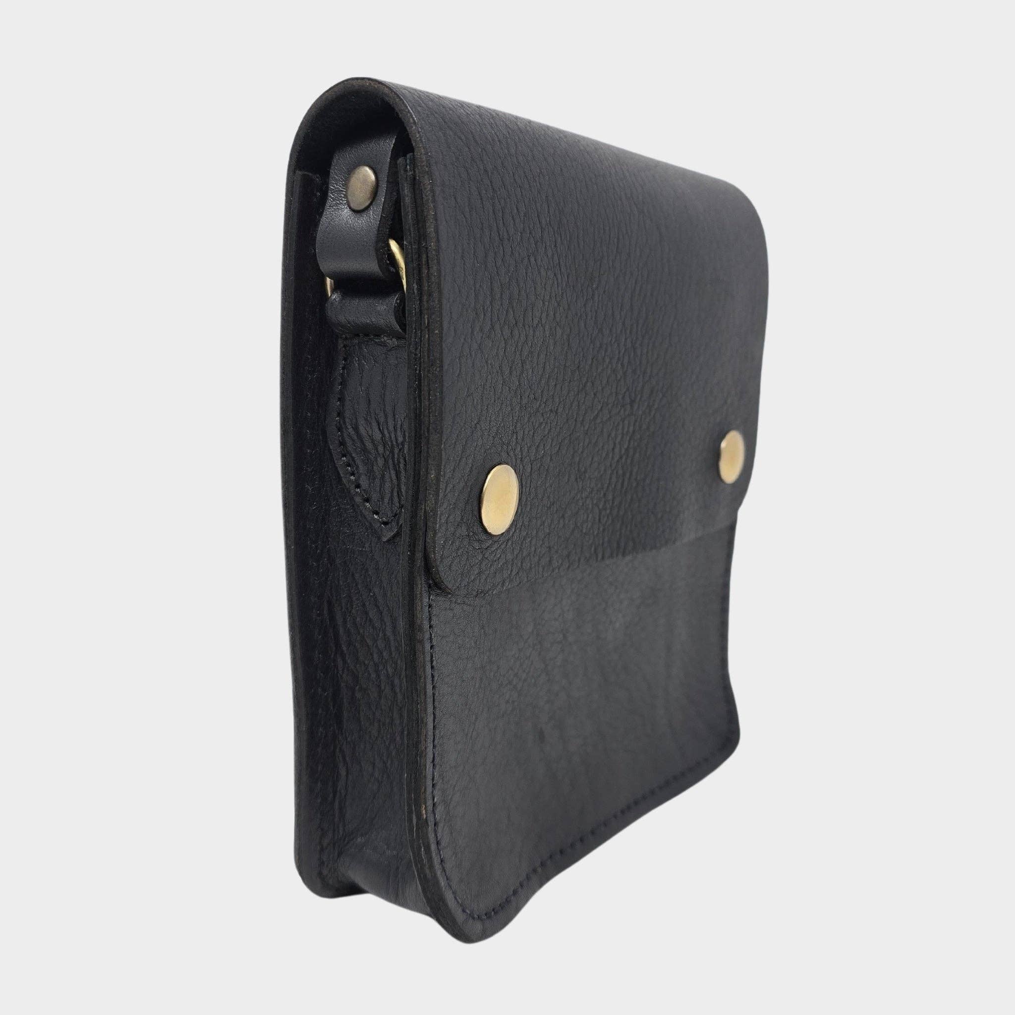 This Black mini crossbody bag combines practicality and style, featuring a spacious main compartment and a discrete zippered pocket under the flap. The golden pop-button closure keeps your essentials safe, organized, and within easy reach, while the adjustable long strap ensures the perfect fit for any occasion.