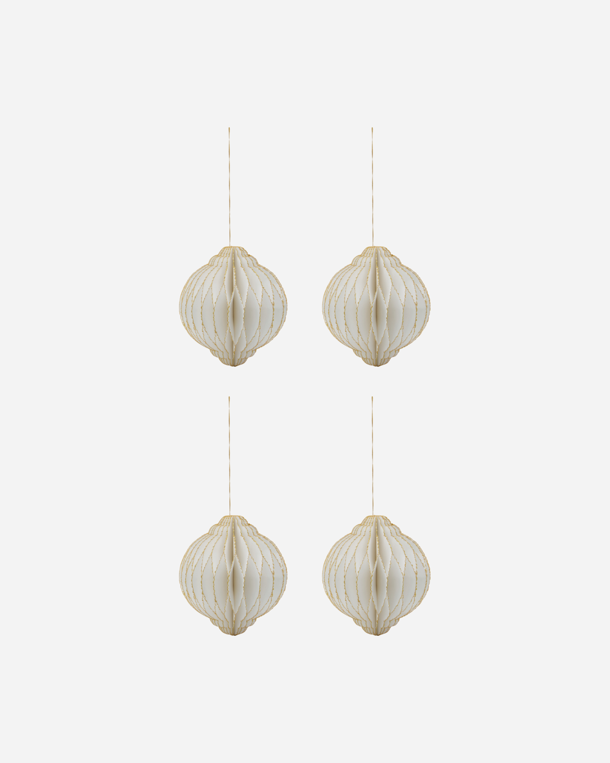 Elevate your festive décor with this exquisite set of four off-white ornaments. Each piece is handcrafted from paper, featuring beautifully deckled edges and handpainted with shimmering gold glitter. Hang them together to create a magical atmosphere, or display them elegantly on a branch or within a decorative bowl with other pieces.