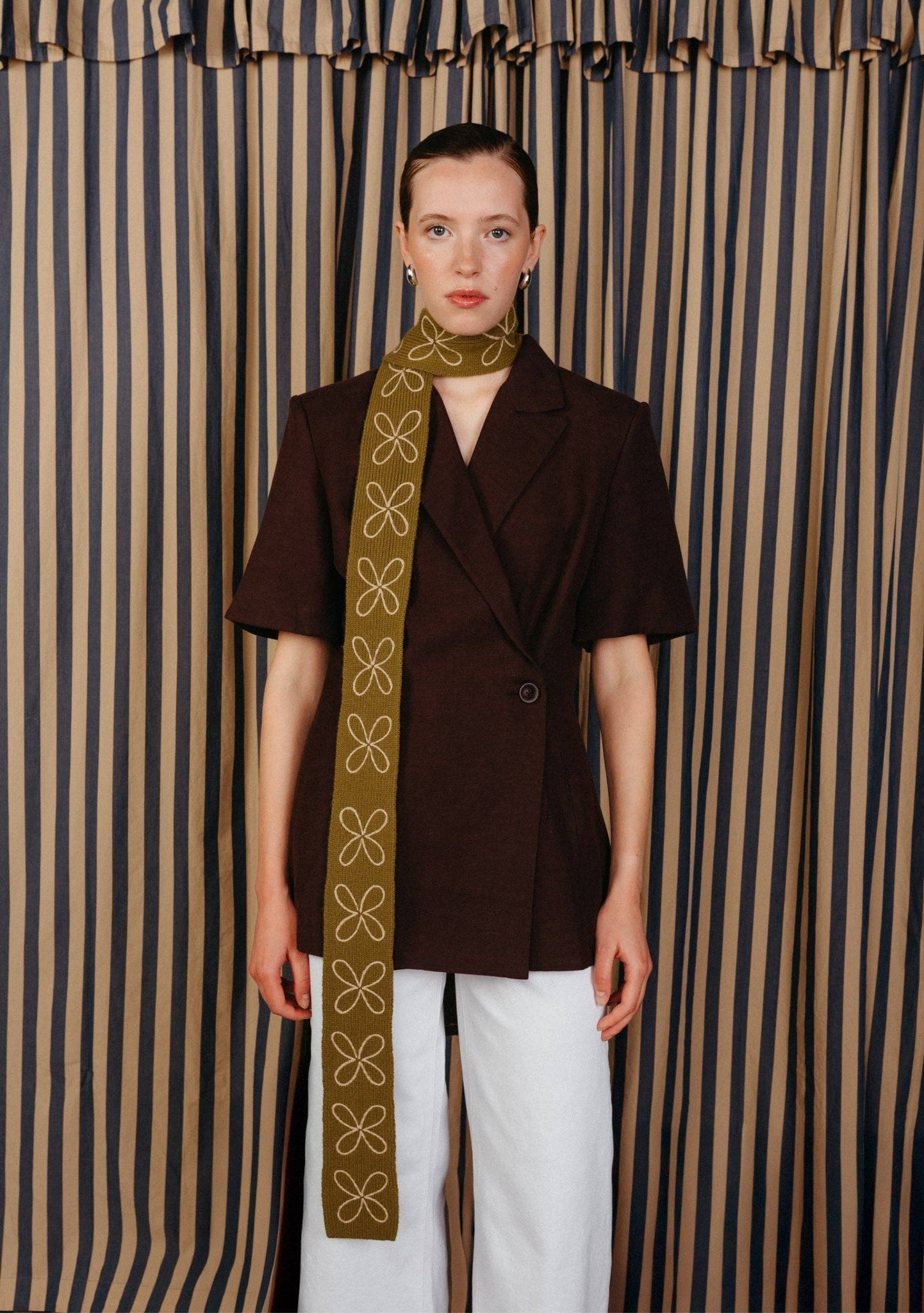 In a season of layering, the smallest pieces can make the biggest entrance. Inspired by vintage showmanship and made from buttery-soft merino wool, this TBCo skinny scarf in olive green with ecru floral pattern is a playful twist on tradition. Lightweight and breathable, it’s perfect for the season shift – the kind of scarf you forget you’re wearing, until someone compliments you on it.