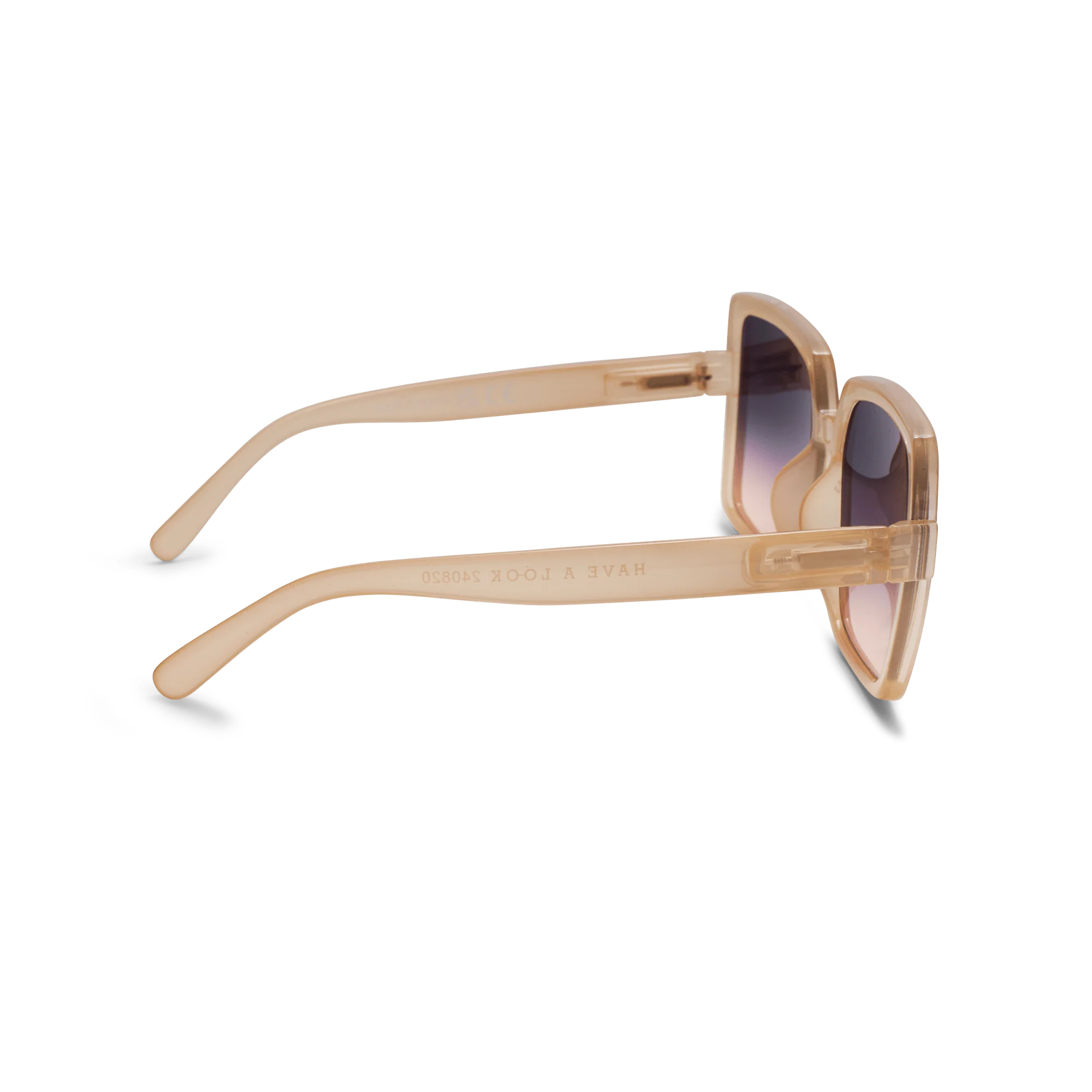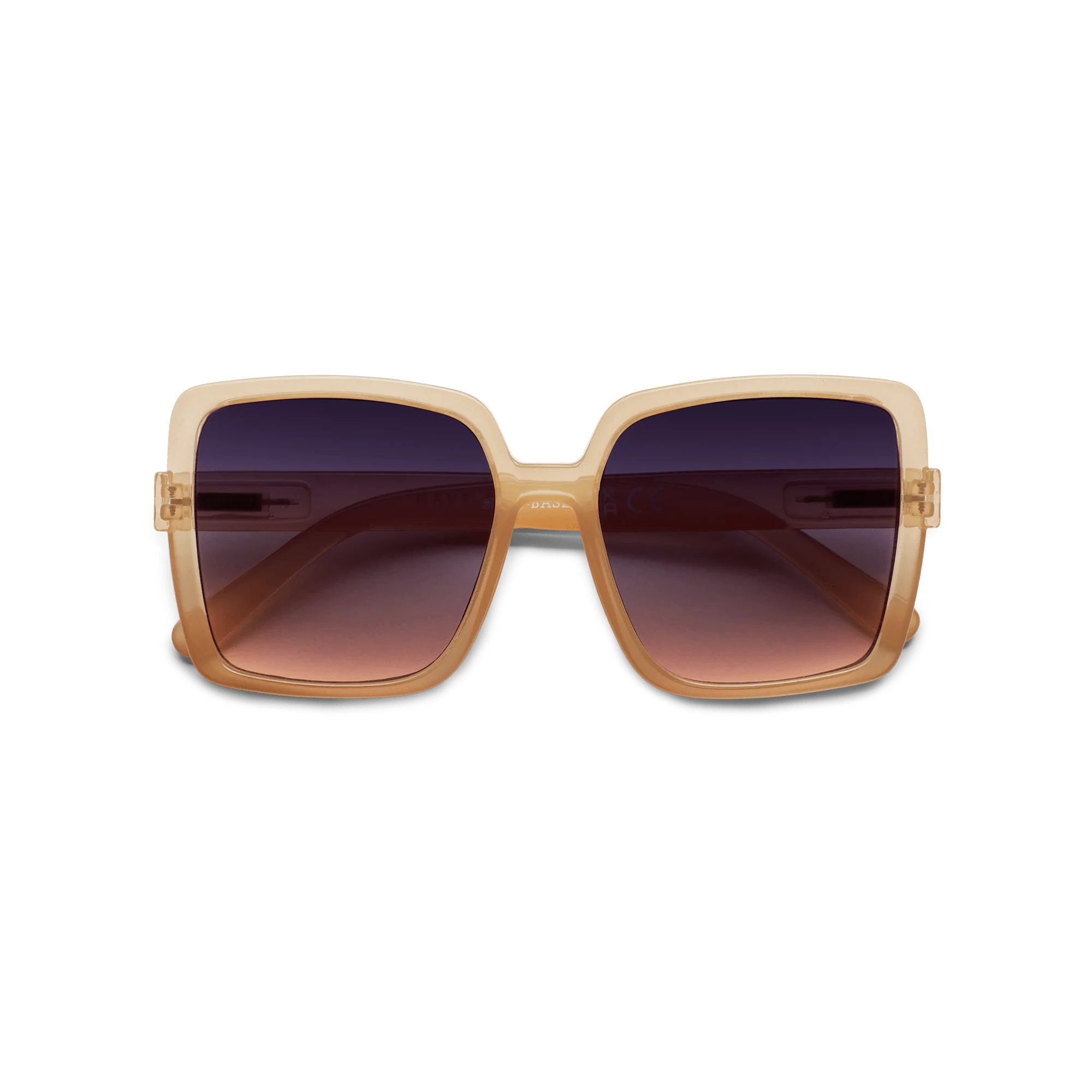 Oversized, square sunglasses with sand-colored frame and purple gradient lenses. ‘Square XL’ by Have A Look are large, square sunglasses with a sleek, minimalistic design. Inspired by the iconic eyewear trends of the 1970s, these retro-style sunglasses come with a modern twist. The frame is lightweight and comfortable to wear.